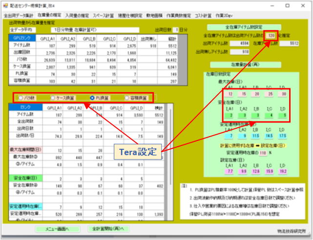 Tera計算ソフトはソフト起動後に入力しなければならない入力項目が300以上ある。 この入力項目数は物流知識が豊富な熟練者でも時間がかかりソフトの使用を諦めてしまう、 また、初心者は入力画面を見ただけで高い壁を感じると想像する。 Tera計算ソフトは入力項目に仮の数値を入れてあり、ソフト起動後、 何も入力せずに配送センター規模や敷地面積を算出できるようにしている。 この事前に入力されている仮の数値をTera設定と呼ぶ。(右図参照) Tera設定は入力値の変更が可能で、変更は全て再計算に反映される。 Tera設定した各数値の妥当性は論議されるところだが、 操作者が業種・規模により適正値を見出し、Tera設定を変更することで計算精度は上がる。 |