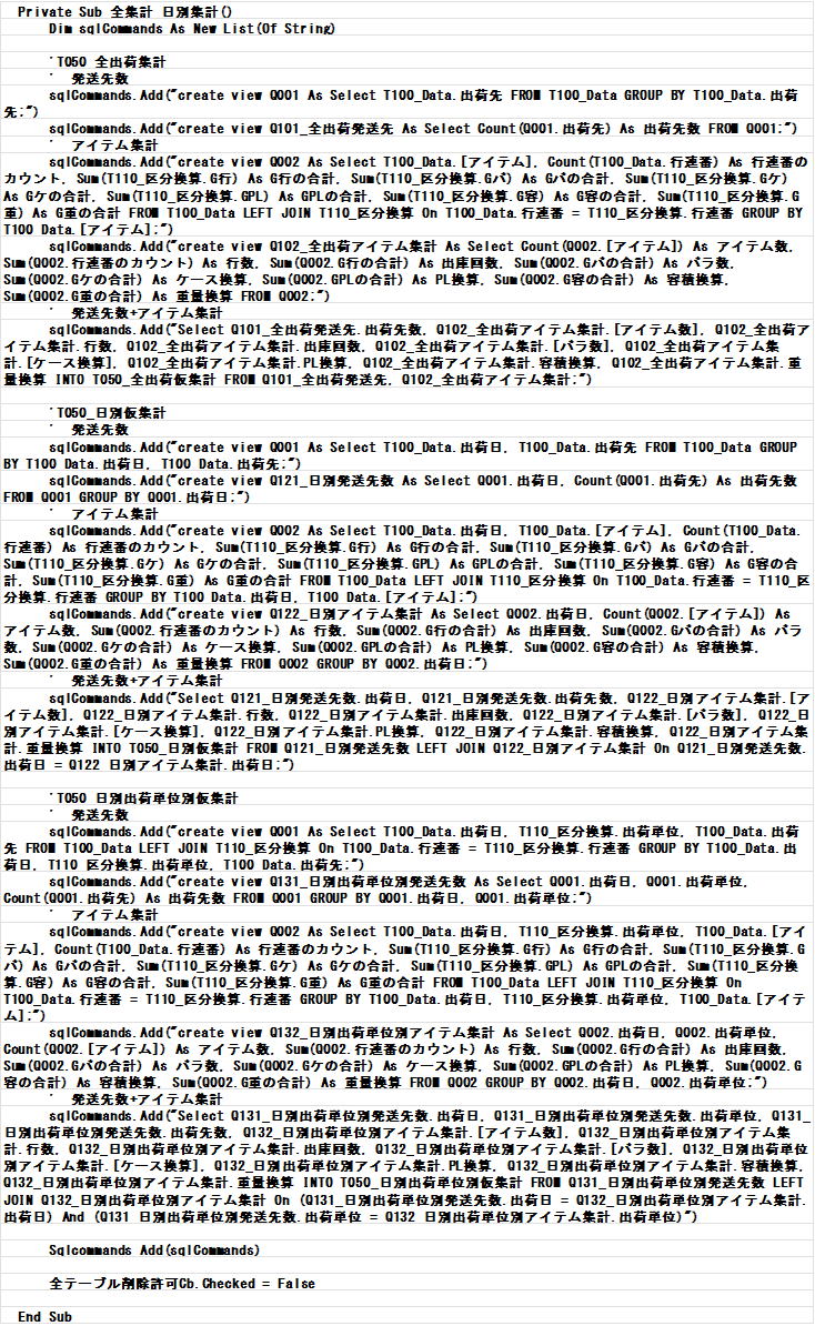 Windows11(64Bit)で作動。 デスクトップPCの使用を想定して画面を1500*900 ピクセルとする。 ノートPC出力に時間がかかるが操作可能である。CPUは制限はないが、「i 5」以上が理想。 出荷データは60,000行あり、PCにはかなり負荷がかかる。 使用言語はVB.NetとADO.NETである。 Accessとの連携及び分析集計はADO.NET のSQLを使用、 SQLは処理スペードの速さと処理命令が明確でメテンスが容易である。 左図はSQLでAccessに全集計と日別集計のテーブルを作成する例。 VB.Netは画面表示及び画面出力後の計算に使用している。 データを保管するDB(DataBase)は普及しているOfficeのAccessを選択した。 ,データベースのデータテーブルを開示、データテーブルを再利用できるようにした。 添付した出荷データはTera計算オリジナルデータである。 20年前の電気系の部品問屋(現在存在しない企業)のデータを参考に作成した。 利用した項目はアイテムと出荷先とバラ数量、出荷先・アイテムは記号化している。 入数やPLケース積載数及びケース容量・重量は一定のルール内で発生させた乱数を持ちいて作成 出荷ルート・アイテム区分・出荷区分・出荷ルートは新たに追加した項目でデータも疑似データである。 出荷月日はリアル性を持たせるために近々の日付にしている。 この出荷データは、計算後の出力結果が実際に稼働している配送センターと差異が出ないよう出荷データの内容を調整している。 出荷データは企業にとって一般公開できない機密データである。したがって適時に出荷データを入手するのは難しい。 著者はこの模擬出荷データにTera計算と同等の価値を感じている、 Tera計算以外の研究にこの模擬出荷データを利用いただければ幸いである。 |