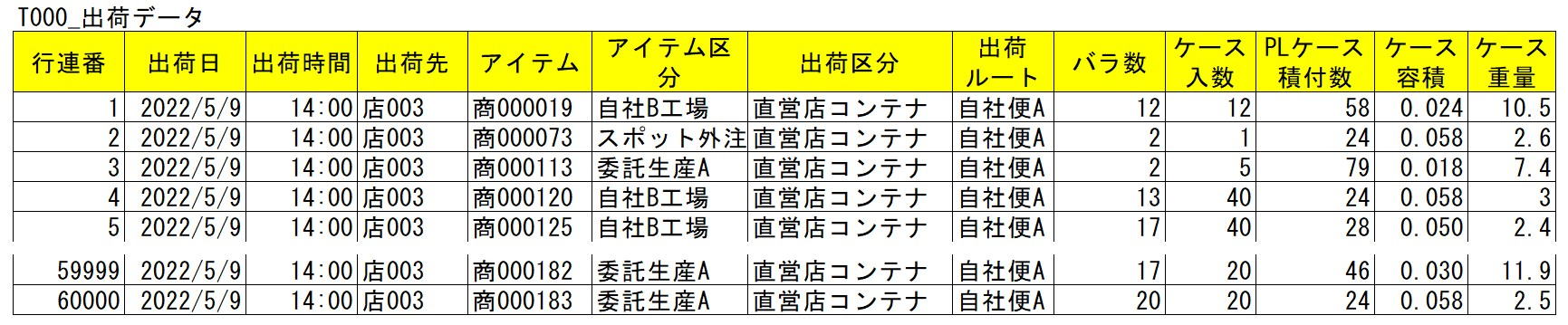 | 配送センターは出荷先の注文に基づき商品を出荷する、この出荷実績をまとめたものを出荷データと言う。 「A出荷先にB商品を10個出荷した」E(Entry)I(Item)Q(Quantity)という記録である。 Tera計算では上記EIQだけの情報では配送センターの設計は出来ないので、必要な項目を追加した。 下記データは出荷データの項目。 |
