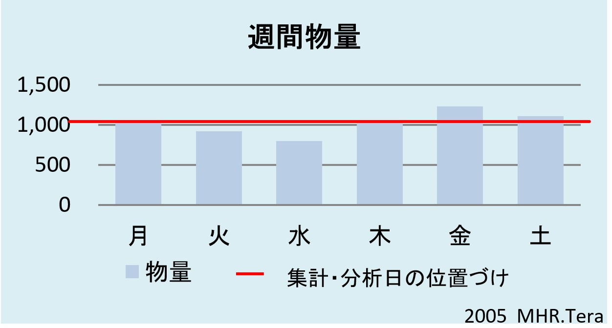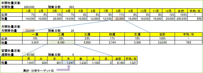 ターゲット日を週間物量のMAXではない木曜に選定した意図は、ピーク日対応を稼働時間延長や増員及び外部委託などで行い、配送センターを経済規模にするため。 物流波動は年。月・週だけではなく、祝祭日や天候、お客様の店舗新設などにも起こる。 |