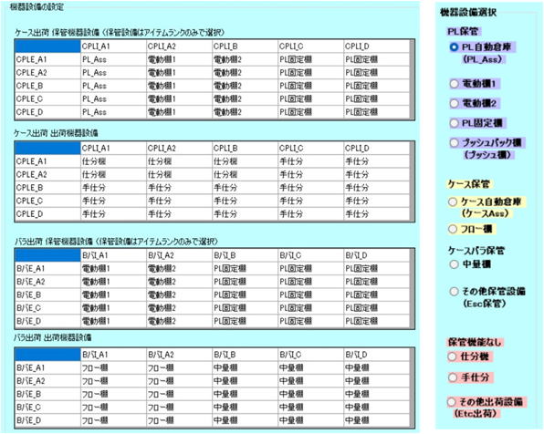 | EIQマトリクス表に物流機器を割付ることにより、物流機器の必要面積や必要処理能力が計算できる。 1.物流機器設備選択欄(左記図)で機器設備を指定する 2.下記表のセルをクリックすることでそれぞれのアイテムランクに機器が割付けられる。 |