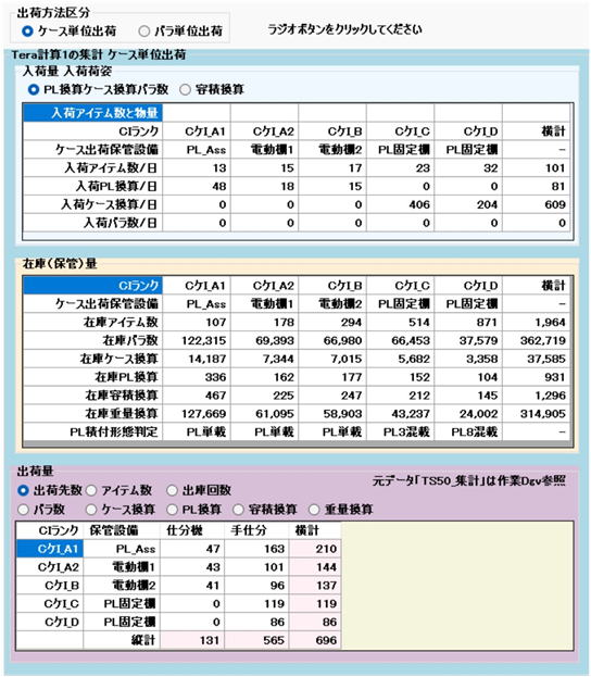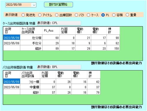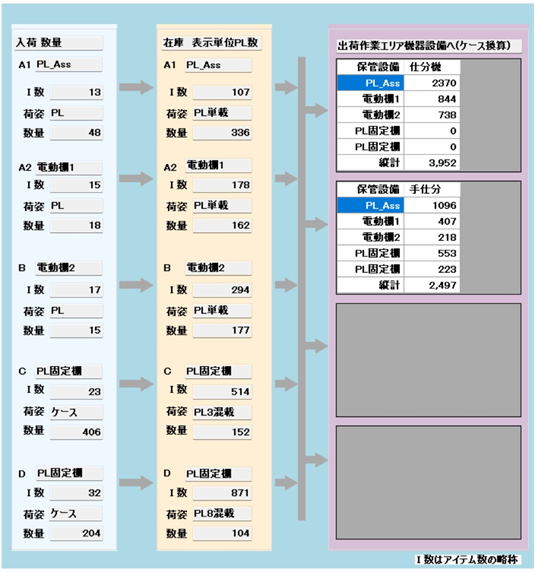 入荷した商品がPL単載(パレットに1アイテム積載)の時は、 機器設備の空き棚にPL単位で保管され、 入荷した商品がケースの時は、 混載保管(パレットに複数アイテム積載)されることが想像できる 出荷作業エリアの機器設備へ物量は、 上記図、「出荷量」欄の選択と同期して、「出荷作業エリア物流機器」の 表記単位が変わる。、 |