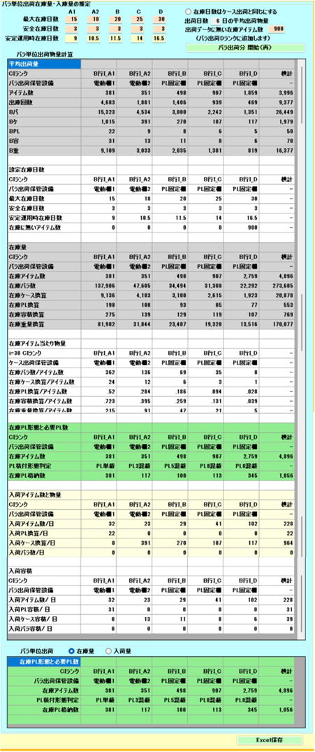 1.最大在庫日数及び安全在庫日数をランク別に入力。 2.出荷データにない在庫アイテム数を入力 3.計算のベースとなる1日の出荷量平均を計算出力 4.安定運用時在庫日数を計算 安定運用時在庫量(保管量) = 安全在庫+(変動在庫/2) 変動在庫=最大在庫-安全在庫 第2節参照 5.安定運用時の在庫量を計算 在庫量は=1日の出荷量*安定運用時在庫日数 6.アイテム当たり在庫量を計算 アイテム当たり在庫数=在庫量/アイテム数 7.必要パレット換算数と単載・混載の判定 ![]() 8.入荷アイテム数と物量計算 入荷アイテム数=在庫アイテム数/入荷サイクル 入荷物量=出荷物量 入荷容積算出(チェック用) 在庫量ラジオボタンを押すと在庫量表示 入荷量ラジオボタンを押すと入荷量表示 9.Excelボタンをおすと、在庫・入荷データがExceh保存l |