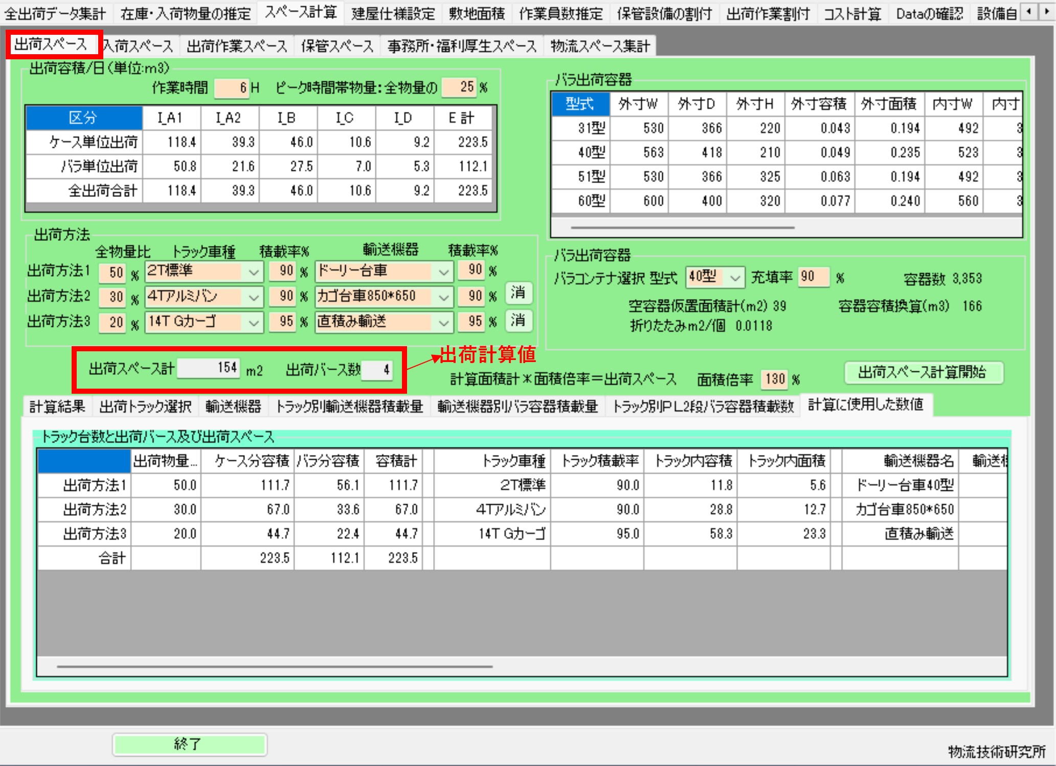 Tera計算2は入荷物量からバース数と入荷スペースを計算した上で、新たに入荷スペースと出荷スペースがどの位共有できるかを入力して、入荷バースと入荷スペースを再計算できるよう工夫している。