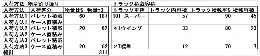 ケース直積みはケース容積を採用して計算。 パレット積載はケース直積み計算*((積載パレット枚数*150)/トラック荷台高)で計算。