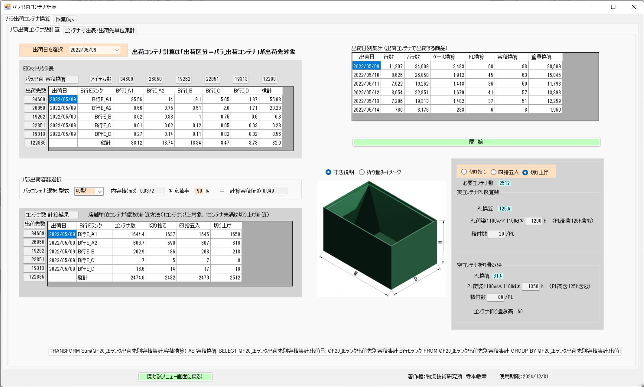 | バラ出荷コンテナを使用した出荷先は、空コンテナの回収が可能な自社便及び専用便に限られる。 1.対象の出荷日とコンテナの型式選択、充填率を入力 2.開始ぼたんをおすことにより 3.ソフトが「出荷区分」のバラ_出荷コンテナ指定の出荷先を抽出 4.出荷先の体積集計より必要コンテナ数及びPL積載時のPL数。 5.また、空コンテナを折り畳みPL保管した時のPL数を計算している。 計算は、単純集計、切り捨て・四捨五入及び切り上げ計算を表示している。 通常はピーク出荷日切れ上げ計算を採用し、これに出荷先からの回収サイクルを考慮して必要コンテナ数を算出する。 |