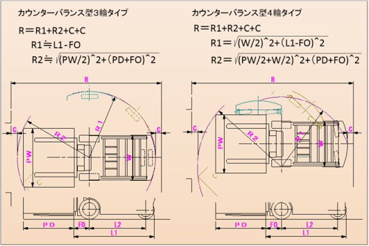 4輪タイプのフォークリフトは前輪車軸の外側に旋回基点がある。