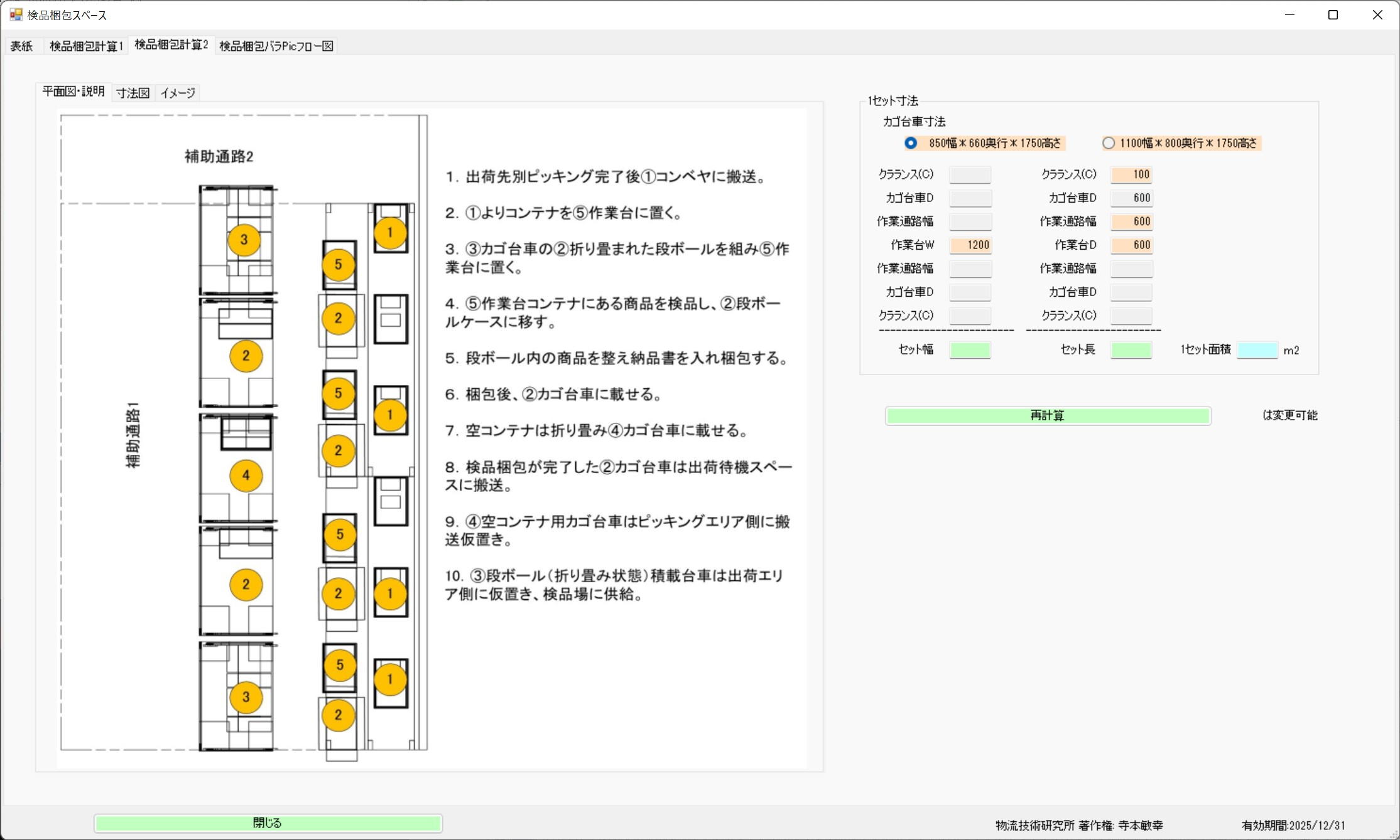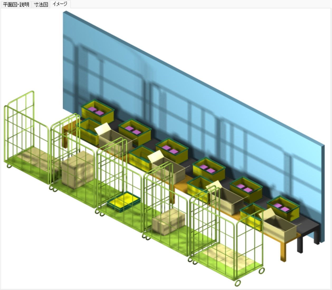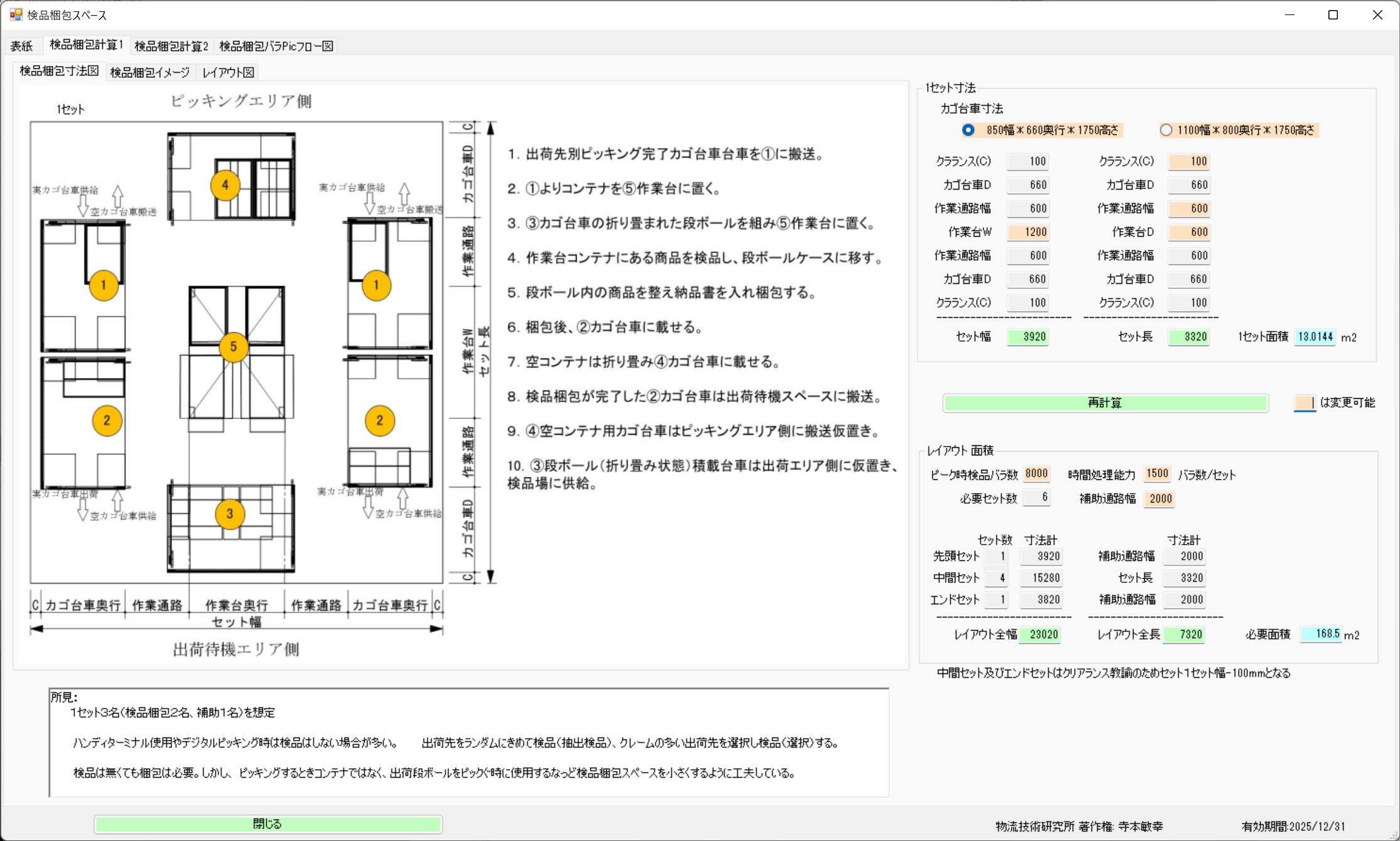 検品作業員4名、補助1名の作業を想定。 カゴ台車寸法や運用方法で作業スペースは増減する。 計算例: 時間当たりバラ数20000個を検品 検品バラ当たり2秒で検品、 1セット4名でばら当たり0.5秒で検品可能、 1セット当たり時間処理能力=3600/0.5=7200個 必要セット数=20000/7500=2.8セット=>3セット 必要面積13m2*3セット=39m2となる。 |