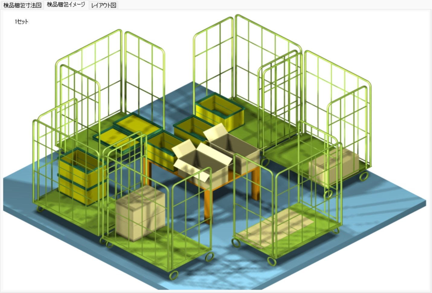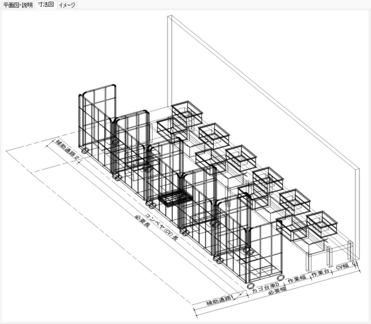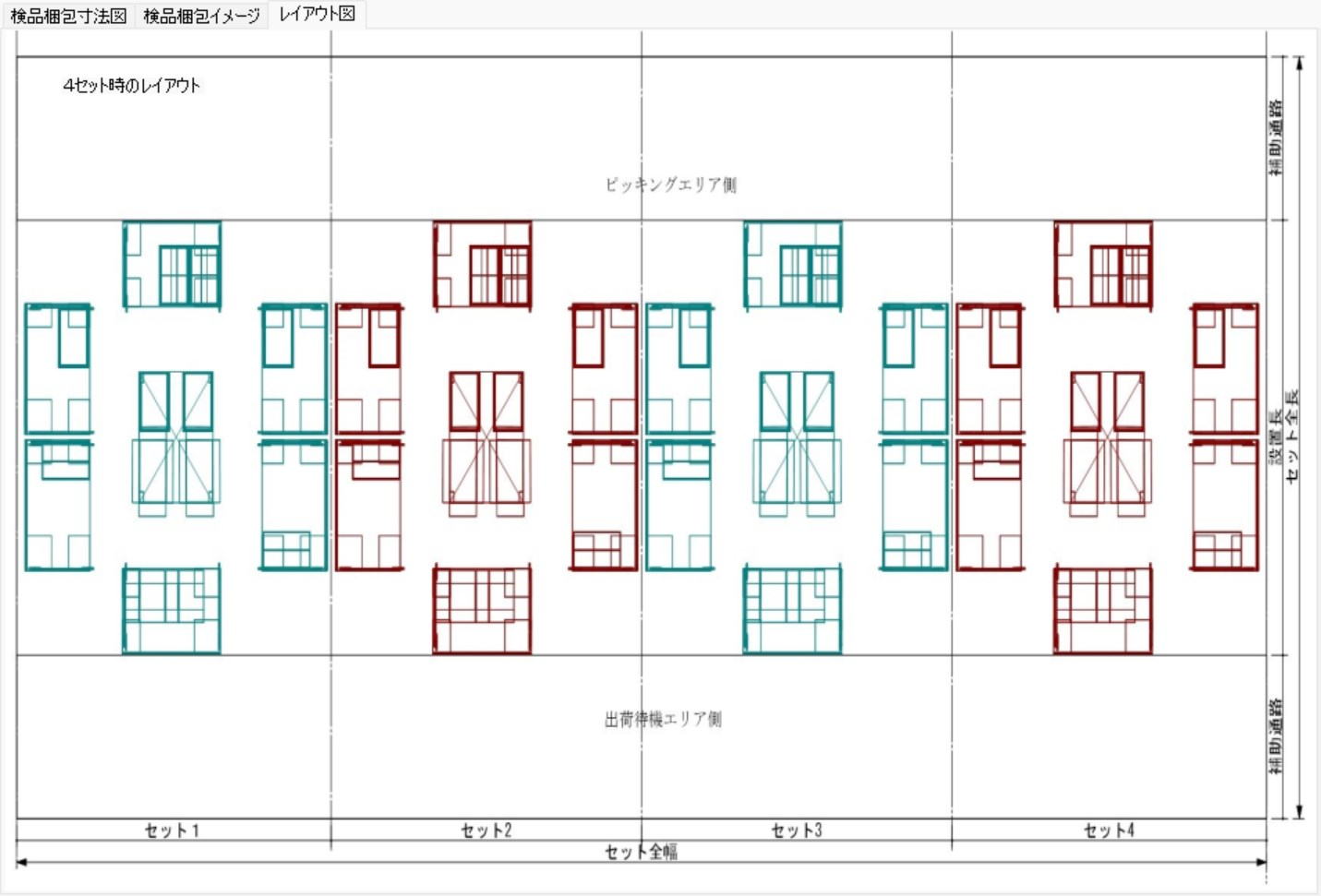 検品作業員4名、補助1名の作業を想定。 カゴ台車寸法や運用方法で作業スペースは増減する。 計算例: 時間当たりバラ数20000個を検品 検品バラ当たり2秒で検品、 1セット4名でばら当たり0.5秒で検品可能、 1セット当たり時間処理能力=3600/0.5=7200個 必要セット数=20000/7500=2.8セット=>3セット 必要面積13m2*3セット=39m2となる。 |