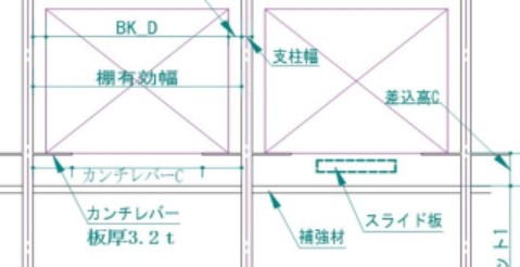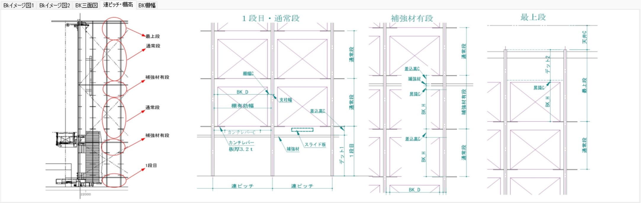 棚構造は 一段目・最上段及び補強材有段と通常段にわかれる。 Tera設定数値を変えことにより 変更を反映して自動計算される |