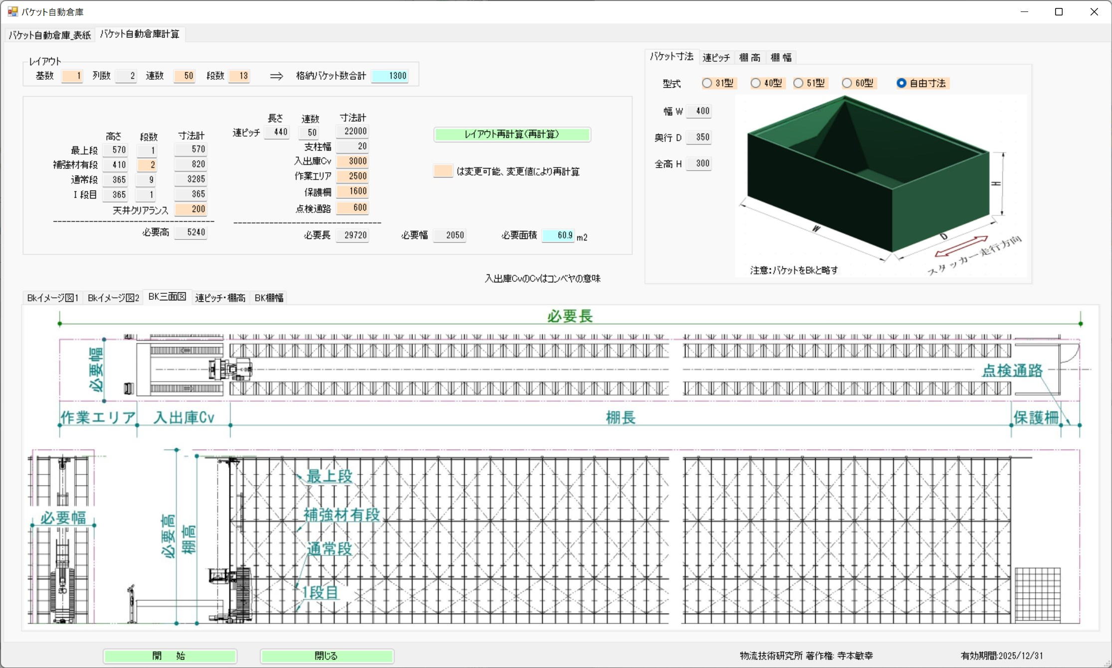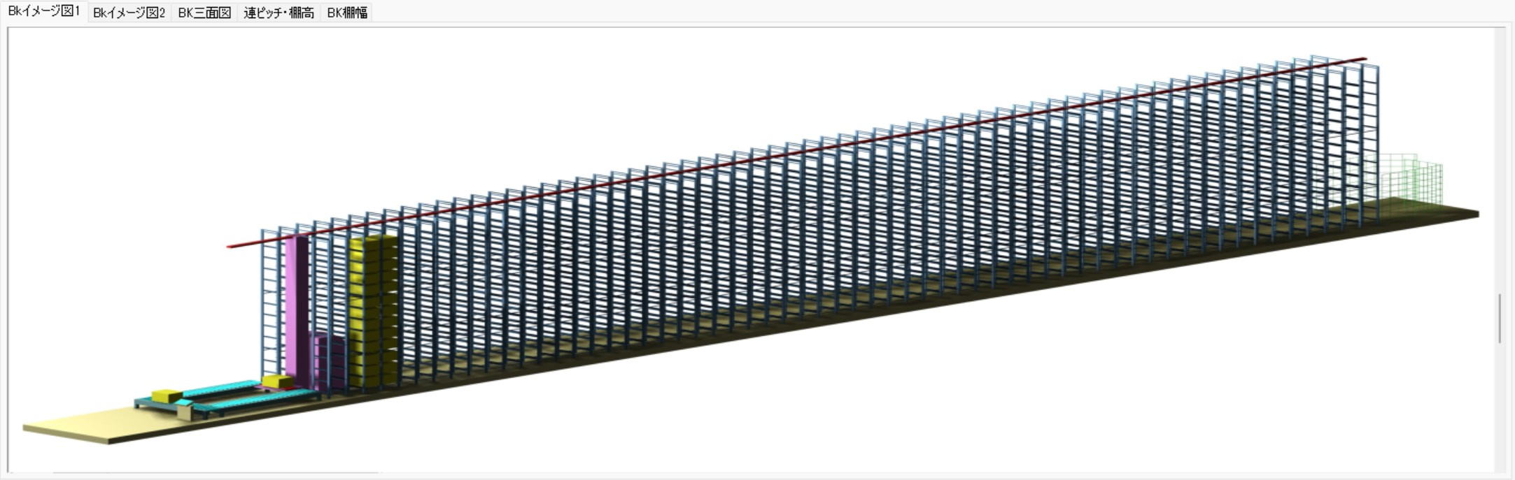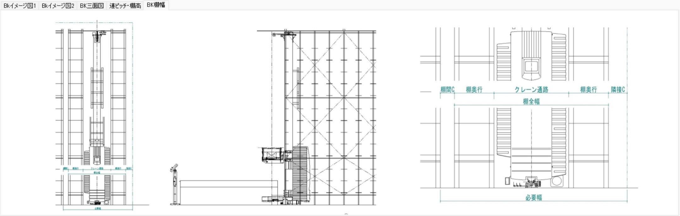棚幅は 51型コンテナ550mm場合 棚奥行555mm*2列・クレーン幅800mmで1910mmとなる 建屋隣接クリアランスは200mm クレーン2基の場合の基間クリアランスは150mmとなる。 |