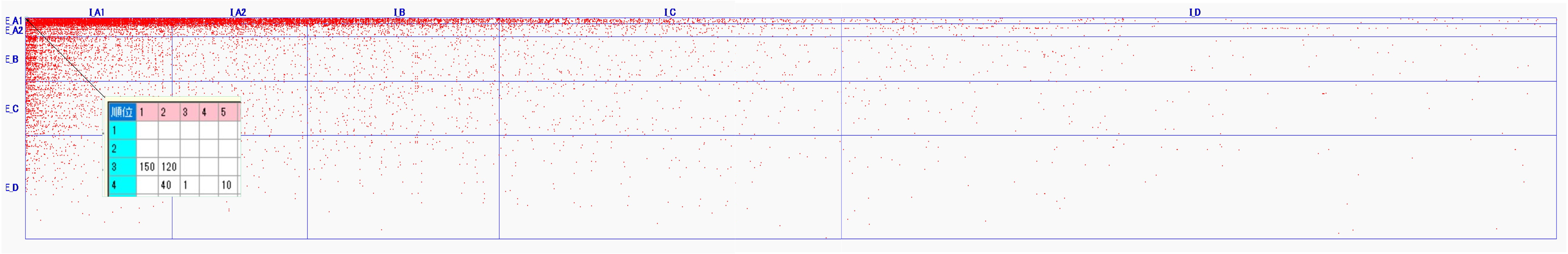 EIQ表の1マス(セル)を点で表現し、出荷データ全体を一画面で表示した表がEIQ散布図である。