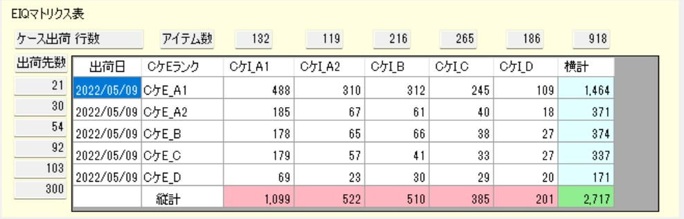 | EIQ表を、アイテム5ブロック*出荷先5ブロック=25ブロックに分けて集計したものがEIQマトリクス表である。 経験から、システム設計時、機器設備を割付付けるに都合の良いブロック分け数と考えている。 この表は、必要に応じてケースやPL・容積に換算した数値を計算することが可能。 従来計算と同時に表示しているので、従来計算方法と比較しながら学習してほしい。