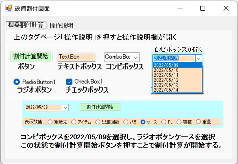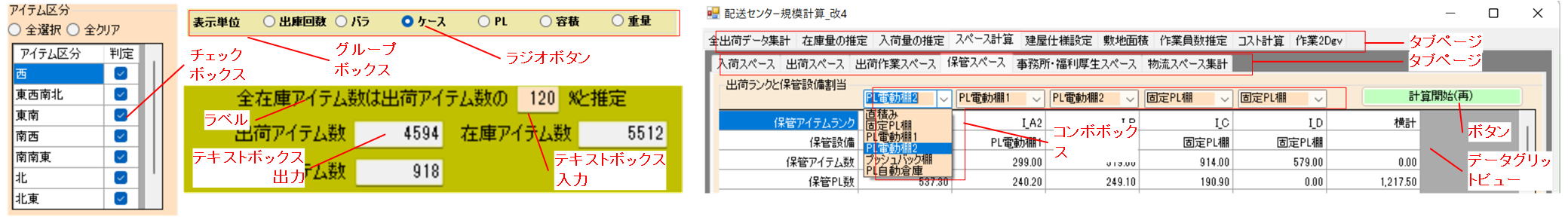 タグページは付箋を付けて、見たいページを付箋頼りに開くイメージ。タグページの中にタグページを置くことが出来て、木の幹から枝へ枝から小枝、小枝から葉へと系統だった細部へ画面をコントロールできる。 ボタン(Button)は押す(クリックとも言う)とそのボタンに表示された処理や計算をする。 テキストボックス(TextBox) は文字や数値を入力する窓(表示欄)で、操作者はこの窓に入力文字や数値をタイピングし、ソフトがこの情報を受け取る。テキストボックス(TextBox)のもう一つの役割は計算処理した結果を出力ための欄で、ここに表示された情報は入力変更できない。 |